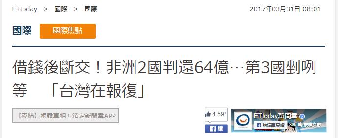 “台湾在报复”,外媒一篇报道,让台媒顿感兴奋,在标题打出这样五个字眼。那么是什么“好事”呢?据台湾“东森新闻云”援引路透社报道,台湾的“中国输出入银行”和与台“断交”的3个非洲国家打官司,其中两起胜诉,成功追讨超过2.12亿美元的未偿还贷款。