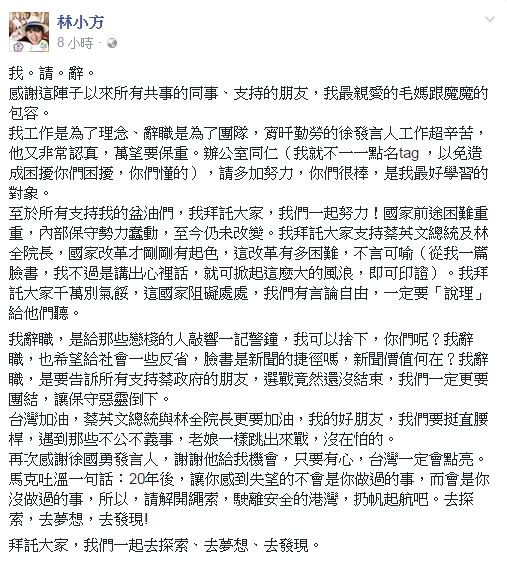 林育卉在文中还声称,自己辞职“是给那些恋栈的人敲响一记警钟,我可以舍下,你们呢?我辞职,也希望给社会一些反省,脸书是新闻的捷径吗,新闻价值何在?我辞职,是要告诉所有支持蔡‘政府’的朋友,选战竟然还没结束,我们一定更要团结,让保守恶灵倒下”。