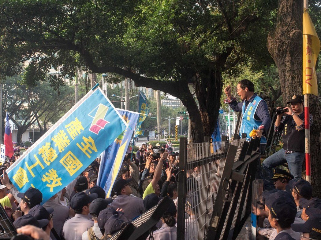 据台湾“联合新闻网”3月29日报道,29日一早,由台湾警消联盟大动员发起军公教游行,游行分7路,抗议年金改革。其中全教产成员一早就包围“教育部”,要求“教育部长”潘文忠出面说明,但他迟迟未出面,引发成员骚动。