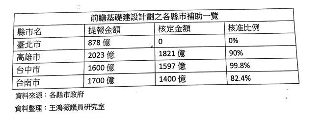 王鸿薇指出,前瞻计划补助严重不均,高雄提供2023亿元,“政院”核定1821亿元,比例达九成;台中提报的1600亿元只小删3亿元,几乎全数通过。台北却因柯市府事前争取不力、事后装聋作哑,9项提案全被打枪,而市长施政报告中一字不提,她要严重抗议。