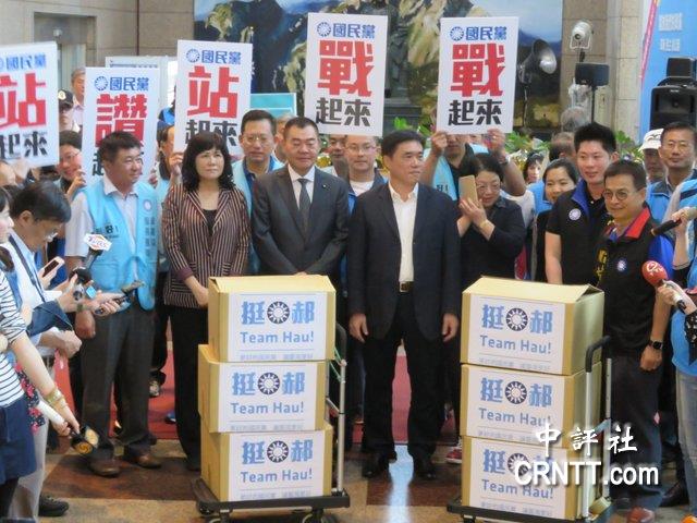 环球网综合报道 国民党主席参选人郝龙斌18日上午率支持者30多人赴党中央办理登记,他们举牌高喊“国民党‘战’起来,全力支持郝龙斌”,并缴交6大箱共10万多份联署书。