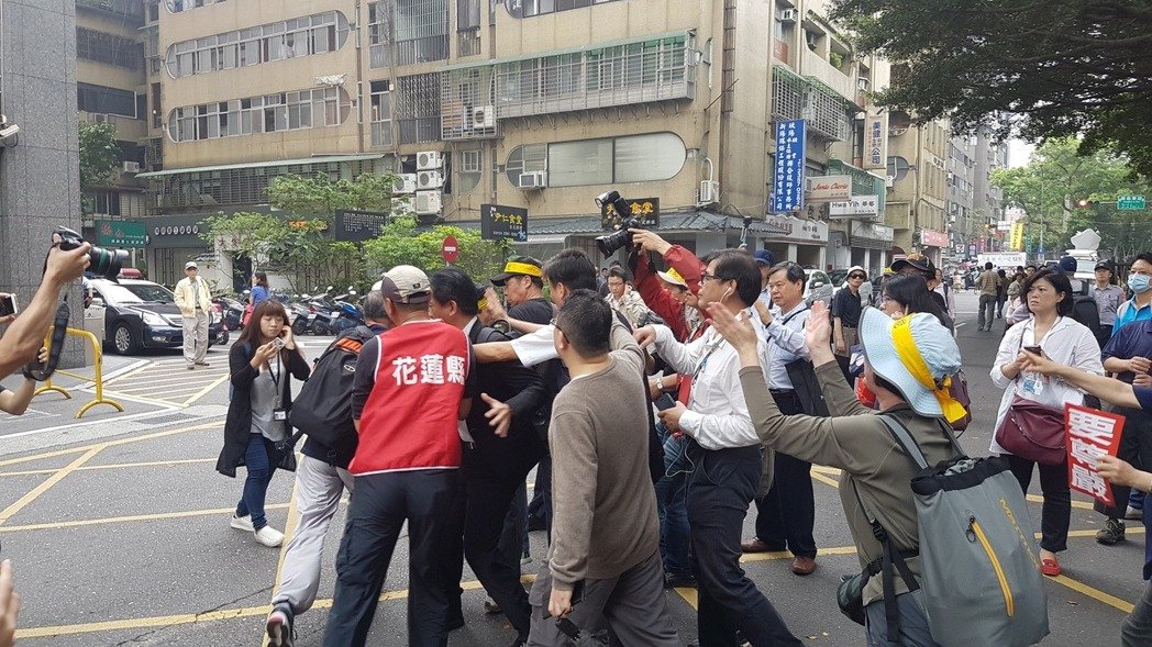 反年改团体包围“立法院”,民进党籍“立委”林俊宪遭群众推挤拉扯。(图片来源:台湾《联合报》)