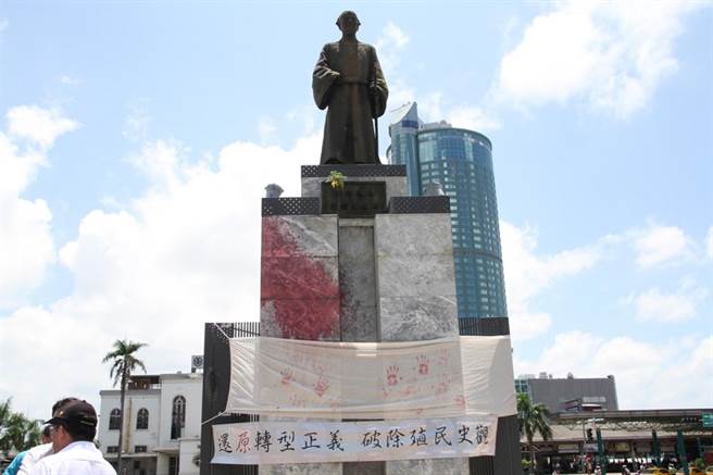位于台南的郑成功铜像曾遭人泼红墨水破坏(图片来源:“中时电子报”)