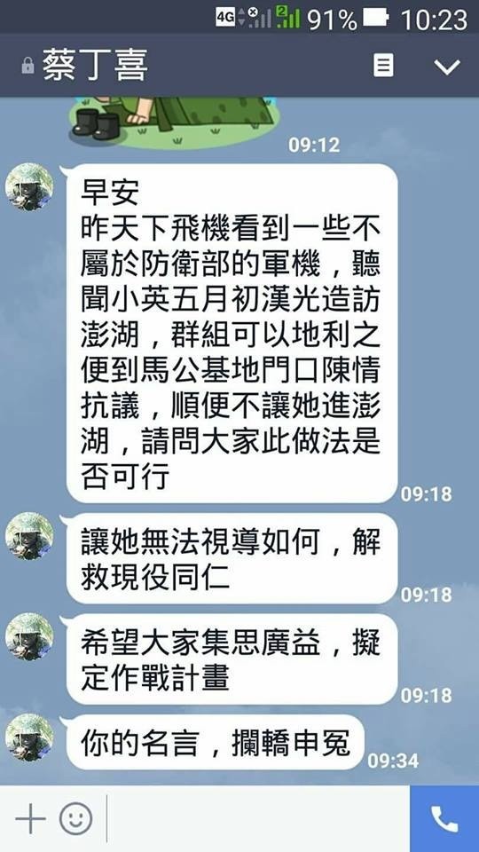海外网4月25日电 据亲绿台媒报道,澎湖即将于5月份举行“汉光”实弹演习,蔡英文将以“最高统帅”身份抵澎,不料行程疑被退伍军官泄密。“澎防部”前副参谋长蔡丁喜20日在聊天软件群组及脸书上发文,号召退伍弟兄前往台空军“马支部”围堵蔡英文陈情,并称“解救现役同袍”。
