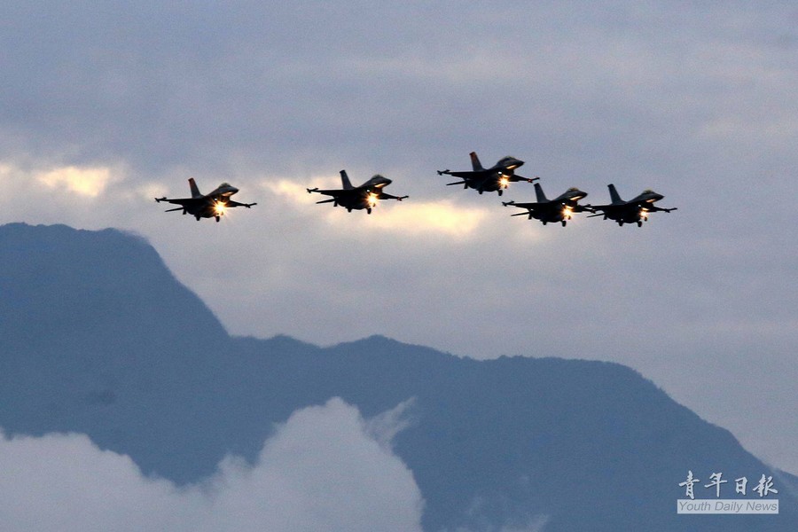 2017年1月1日元旦来临之际,台湾“空军”第401联队出动5架F-16战斗机组成大编队进行飞行训练,展示实力。