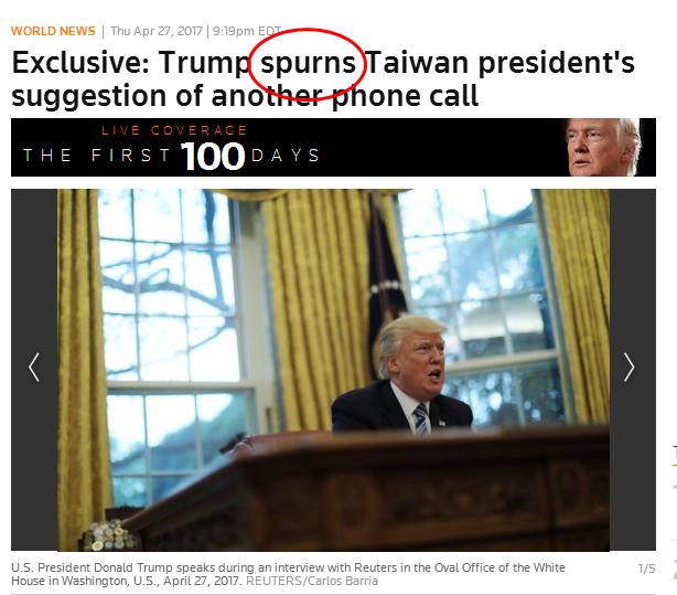 路透社4月27日发布题为“特朗普‘一脚踢开’蔡英文的再次通话的建议”独家报道