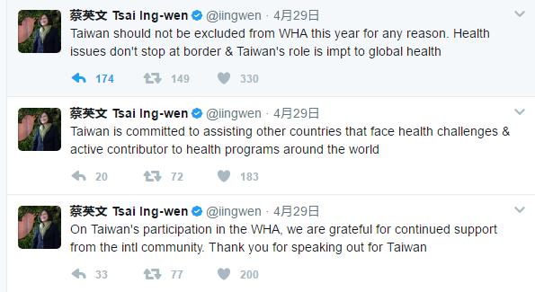 为求世卫大会门票,蔡英文4月29日首度推特发文,向国际“喊话”。(图片来源:网站截图)