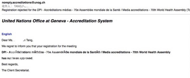 联合国欧洲总部以电邮通知台湾某官方媒体记者,拒绝核发WHA采访证