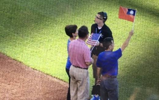 而他之所以今天成为全台湾多家媒体的焦点,不仅因为他最近去美国堪萨斯州的黎雾市为当地的一场棒球比赛开球,从而成为了台湾第一个为美国棒球职业大联盟开球的县市首长,还因为他在开球时一直挥舞着台湾的“国旗”…