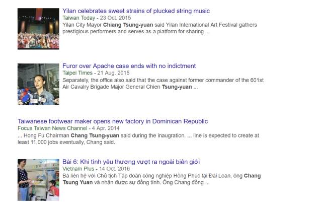 而且耿直哥可是通过搜索引擎搜索了半天呢。比如,当我把那位台湾宜兰市民进党的市长江聪渊的英文名字“Chiang Tsung-Yuan”输入后,搜索引擎给出的结果只有区区四个,而且最新的一个还是2016年的…