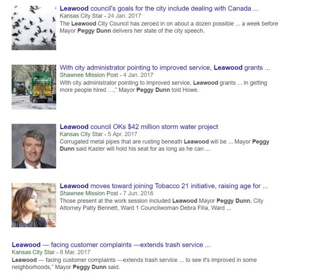 然后,我又把美国堪萨斯州黎雾市的名字Leawood和当地市长Peggy Dunn的名字输入搜索引擎,可英文的搜索结果中同样没有任何与这次引发台湾媒体高潮的“开球事件”相关的任何信息…