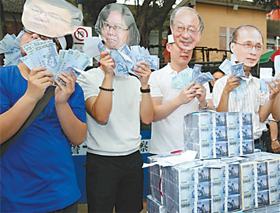13日,上千民众在台北示威要求蔡英文下台。图为示威者戴着蔡英文等人的面具讽刺台当局乱撒钱。