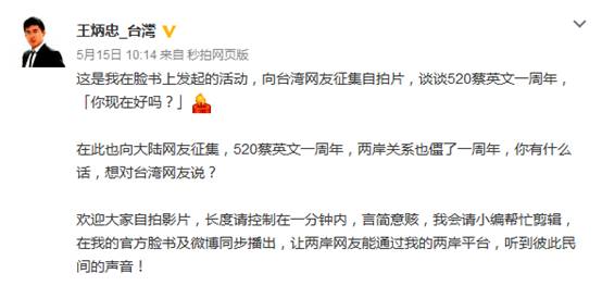 原来,这是台湾新党青年委员会委员王炳忠5月15日自己的微博和脸书同步发起了一项名为“你现在好吗?”的视频自拍征集活动,他“向台湾网友征集自拍片,谈谈520蔡英文一周年。”