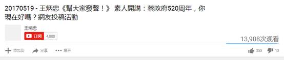 王炳忠还表示:“在此,也向大陆网友征集,520蔡英文一周年,两岸关系也僵了一年,你有什么话,想对台湾网友说?”