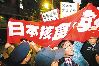台湾当局的媚日在岛内激发强烈反弹。为抗议日本核灾食品输台,有民众拿着抗议布条到蔡英文办公地点抗议。 (图片来源:台湾《联合报》)