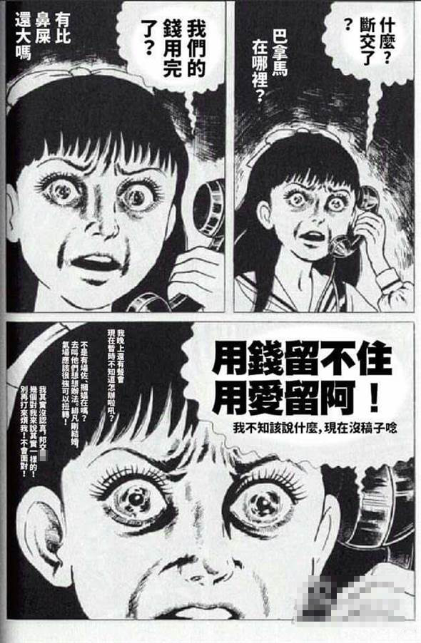 这则三格漫画改编自日本漫画家楳图一雄的恐怖漫画《漂流教室》,画中女主角拿着电话筒,表情惊恐地说:“什么?‘断交’了?”、“我们的钱用完了?”、“用钱留不住,用爱流啊!(我不知该说什么,现在没稿子念)”。