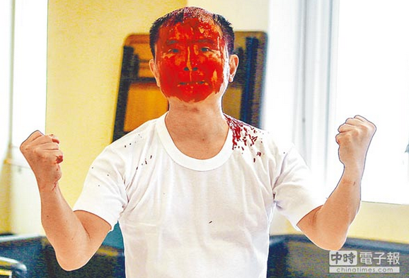 有人用罐子装着红漆往自己身上泼,呈现出满头及满地鲜血的画面。(图片来源:台湾“中时电子报”)