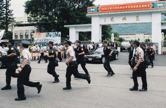 蔡英文6月30日前往台湾“国防大学”复兴岗校区,出席“三军六校院联合毕业典礼”。蔡车队离开,警方与“国安”特勤人员用跑步的方式跟在车队旁,避免抗议群众再度肉身拦车。(台湾“中时电子报”资料图)