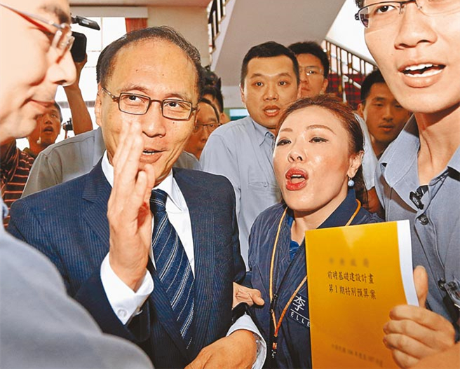台湾“立院”13日下午召开临时会,台当局“行政院长”抵“立院”时从侧门进议场,但还是被国民党“立院”党团副书记长李彦秀(右二)拿着预算书表达抗议。国民党女力表现强悍,成议场内最吸睛的一群。(图片来源:台湾《中国时报》)