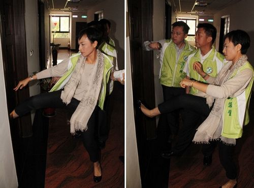 2013年4月中旬,民进党“立委”邱议莹因不满陈水扁于清晨移监,冲到“法务部”,踹破时任“法务部长”曾勇夫的办公室大门,遭“法务部”控告毁损罪。(图片取自网络)
