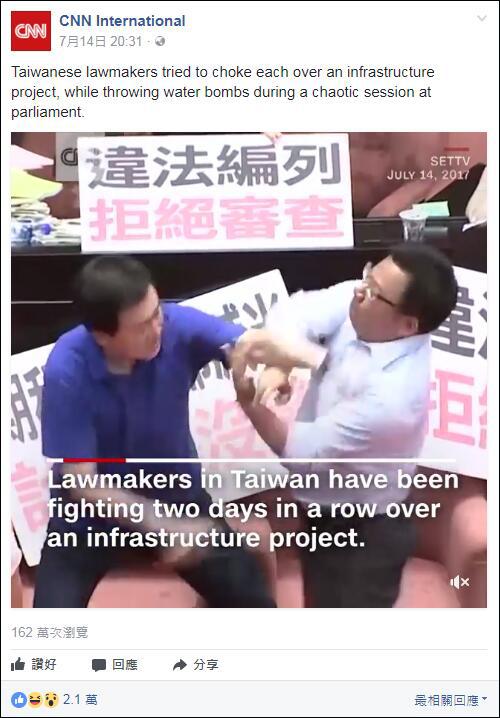瞧这阵仗,岛内已经压不住火了,知名度一下扩展到国际舞台,引来一大批“歪果仁”的关注。据台湾联合新闻网报道,14日,CNN把剪辑过的群架视频贴在脸书上,不到一天时间,观看次数超百万,截至16日下午,有2.1万人表达情绪,1.2万人分享,3千多人留言。
