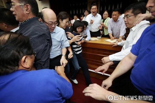 台当局“立法院”14日第2次临时会继续处理前瞻预算再度引爆冲突,议场内处处战场,蓝绿“立委”互相拉扯推挤。(图片取自台湾“中时电子报”)