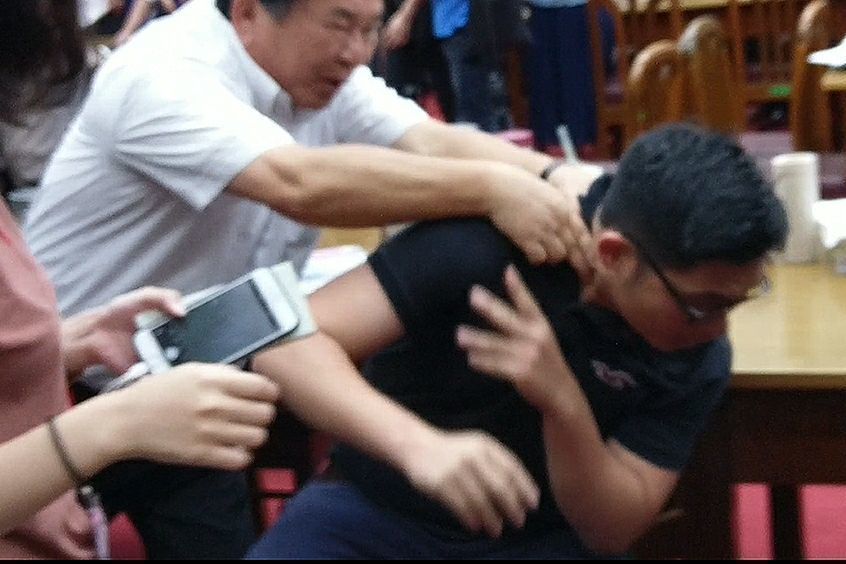 民进党“立委”陈明文突然掐住国民党“立委”许毓仁的脖子。(图片来源:台湾《联合报》)