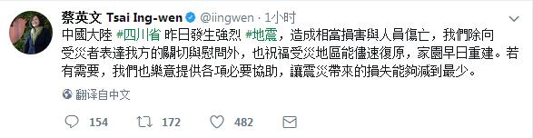 台湾地区领导人蔡英文9日也透过推特发文,对大陆受灾群众表示关切,并表示“乐意提供各项必要协助”。