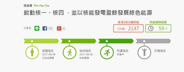 网友提案“启动核一、核四 ,并以核能发电盈余发展绿色能源”,要求有三项重点:重启核一,启动核四,启动核能电厂,解决限电危机,并以核能发电盈余发展绿能;上调备载容量;核能决策回归专业,核电厂运转审查,“立委”等不具备核能、电力相关科学素养,应转为具备专业核能知识的人员审查。