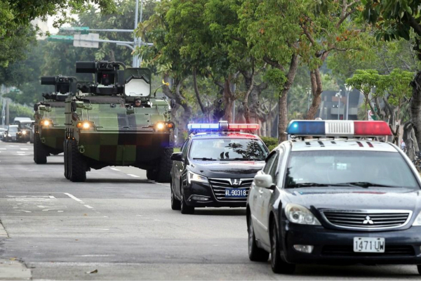 图为蔡英文车队在台装甲车保护下,驶向台防务部门。(台媒图)