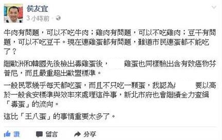 中国台湾网8月23日讯 据台湾“中时电子报”报道,台湾鸡蛋遭普芬尼污染持续延烧,新北市副市长侯友宜晚间在脸谱网(facebook)上发文,认为台当局“农委会”要以高于一般食安标准与效率来处理。侯友宜更强调“这比‘王八蛋’(台北市长柯文哲21日与网友在脸谱网上互呛“王八蛋”,引发关注)的事情重要太多了。”