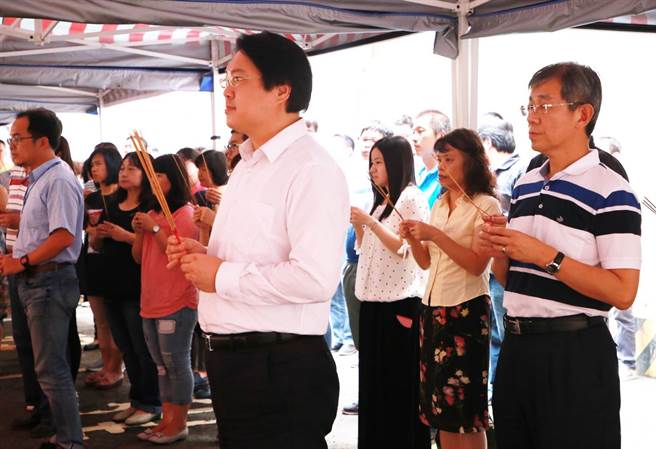 林右昌不慎遭到随员开车门时撞击到脸部,造成右眼周围受伤,今午带伤参加市府举办的普渡行程。(图片来源:台湾《中国时报》)