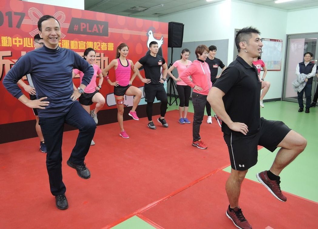 新北市长朱立伦(左)在年初时,跟着运动教练示范甩油操。(图片来源:台湾《联合报》)