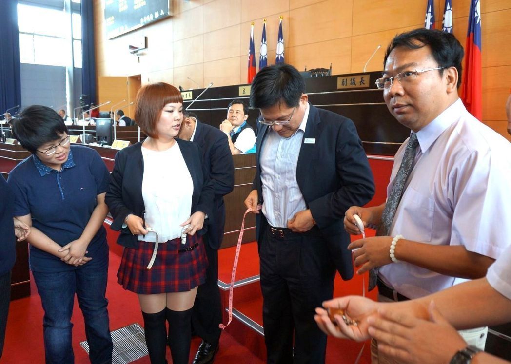 今年6月,民进党议员质询时拿出皮尺,当场要林佳龙量腰围。(图片来源:台湾《联合报》)