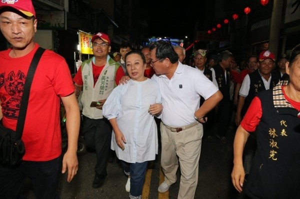 民进党籍嘉义县长张花冠,上周出席活动过程中,遭民进党“立委”陈明文亮度强行搂肩。(台媒图)