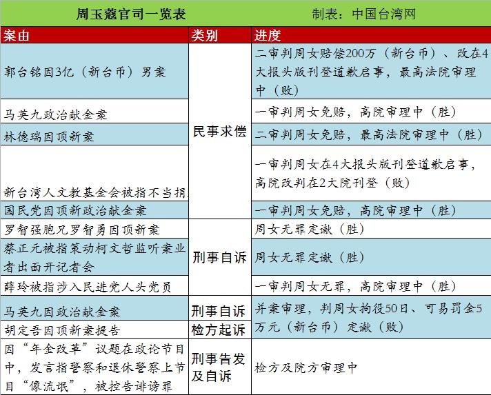 另周前年指前台湾地区领导人马英九捐助成立的“新台湾人文教基金会”,坐拥10亿元资产,是马的竞选金库,遭基金会提告索赔,高院维持北院判决,认定周女的言论与事实不符,因考虑只有2家报纸转载周的言论,判她在这2家报纸刊登启事,现也在最高法院审理中。