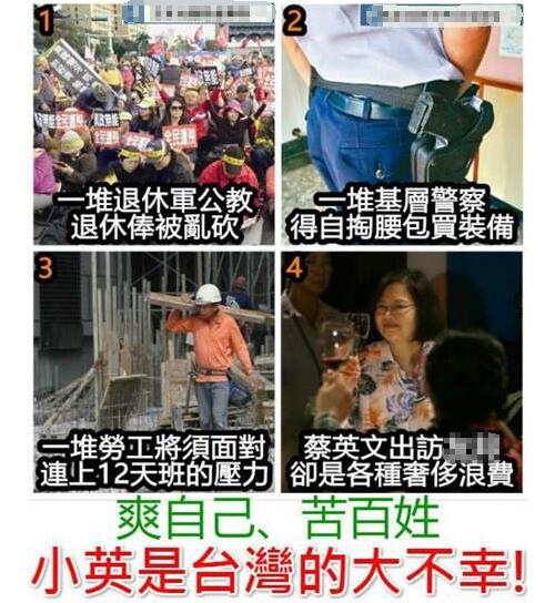 中国台湾网11月8日讯 据台湾《中时电子报》报道,蔡英文当局上任后引发争议不断,近日,脸谱网有社团直呛“小英”爽自己、苦百姓,“一堆退休军公教退休俸被乱砍、一堆基层警察得自掏腰包买装备、一堆劳工将须面对连上12天班的压力,蔡英文出访‘友邦’却是各种奢侈浪费”,更叹其“是台湾的大不幸”!