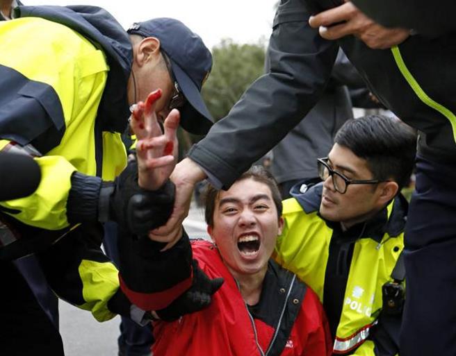 劳团成员发动突袭,其中3人翻过“立法院”大门遭警方以优势人力制伏。(图片来源:台湾《中时电子报》)