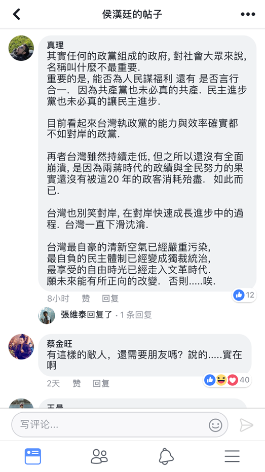 更多网友以文字表达对台湾一边标榜“自由”一边被内耗拖垮现状的愤怒: