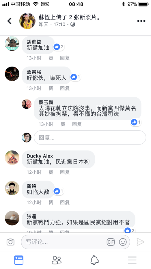 “你我都可能成为下一个王炳忠?”这同样是在台湾社交网络上频繁出现的问句。由于台当局在王炳忠家只搜出几份简体字账册和数张人民币现钞,很多台湾网友也开始以此为梗讽刺民进党,此前表示希望加入中国共产党的台生王裕庆凌晨在朋友圈贴出一份学习十九大文件和一张1元人民币钞票:“估计明天台湾检调在我宿舍只会搜到这些‘罪证’,对不起,台湾检调,人民币那么少,完全是‘共犯’马云的原因,我招供,我是用了支付宝!”