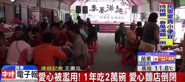 据报道,屏东市里长林群雄与亲友集资250万元(新台币,下同),于去年11月底开设“春风满面”,一碗面卖50元,若有弱势人士需食则不收取费用,意在为贫困弱势提供一餐温饱,却不料如此爱心竟被民众滥用,比如有人天天上面馆食用不付钱,还有人要求打包回家,店家不同意的话就在现场起争执。