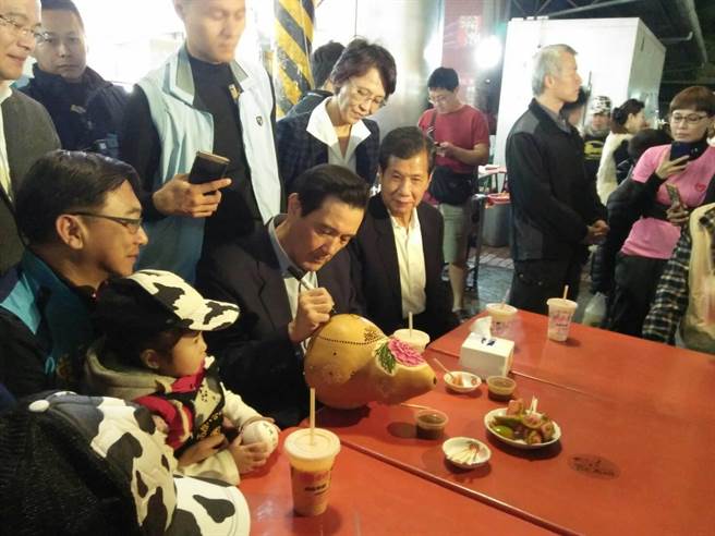 马英九跨年夜到六合夜巿喝木瓜牛奶,并为民众签名。(图片来源:台湾《中时电子报》)