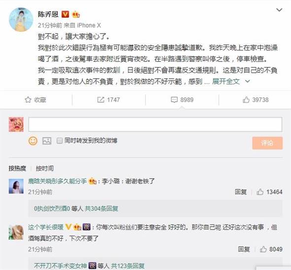 “对不起,让大家担心了。我对于此次错误行为极有可能导致的安全隐患诚挚道歉。我昨天晚上在家中泡澡喝了酒,之后驾车去家附近买宵夜吃。在半路遇到警察叫停之后,停车检查。