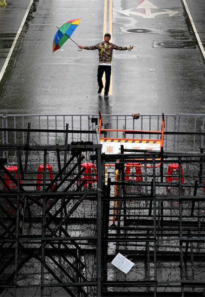 台湾“立法院”8日召开临时会处理“劳基法”修正案,1名男子站在拒马前高声表达诉求。(图片来源:台湾“中国时报”)