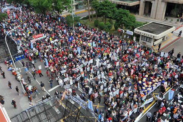 台湾“立法院”临时会,民进党挟人数优势,表决通过修正“农田水利会组织通则”。图为反对改制的各地水利会成员们齐聚在“立法院”外抗议,痛批当局霸占人民财产。(图片来源:台湾《中时电子报》)