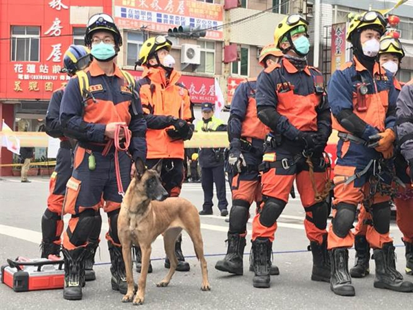 特搜人员与搜救犬进驻翠堤大楼现场。(图片来源:台湾“中时电子报”)