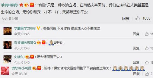 此外,在众多的祈福帖中,还有一种令人无法忽视的温暖声音,那就是“同胞之情”。当如今的台湾被“台独”势力染指时、当一小部分台湾民众被蔡英文当局所谓的“台湾价值”洗脑时,大陆网友则是在大灾面前温情喊话:台湾与大陆是同胞,希望同胞平安!