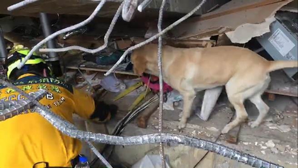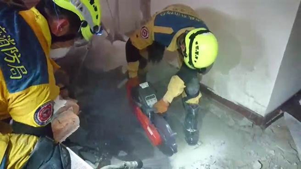 接近中午,搜救人员用生命探测器,侦测到在柜台任职大夜班的2名工作人员,37岁周志轩、20岁梁书玮发出求救讯号,搜救人员把握黄金救援时间,成功救出梁书玮,加紧脚步救援周志轩,在13时28分由搜救犬“铁雄”进入局限空间,发现待救者周男呼吸心跳停止,仍在极力抢救。(中国台湾网 张丽媛)