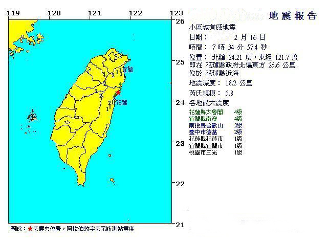 据台湾联合新闻网报道,台气象部门发布地震报告显示,今天(16日)上午7时34分,在花莲县近海(花莲县政府北偏东方25.6公里),发生3.8级有感地震,地震深度18.2公里。最大震度:花莲县4级、宜兰县4级、南投县2级、台中市2级、桃园市1级。