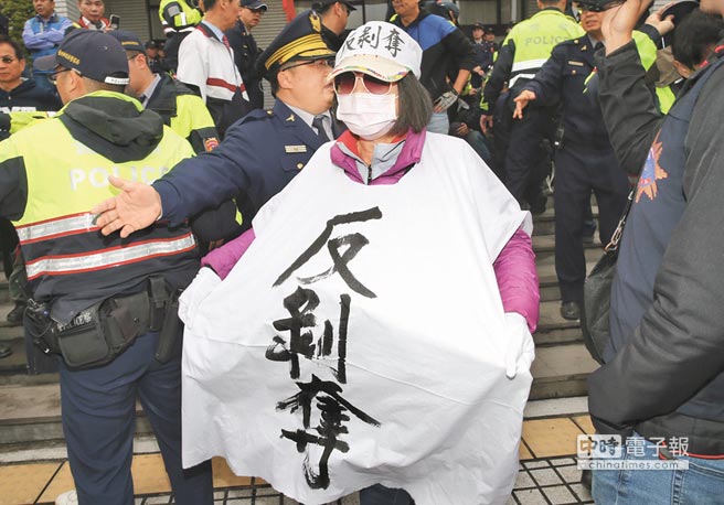反军人年改团体27日突袭“立法院”,一位抗议者在身上穿着“反剥夺”布条表达不满。(图片来源:台湾《中时电子报》)